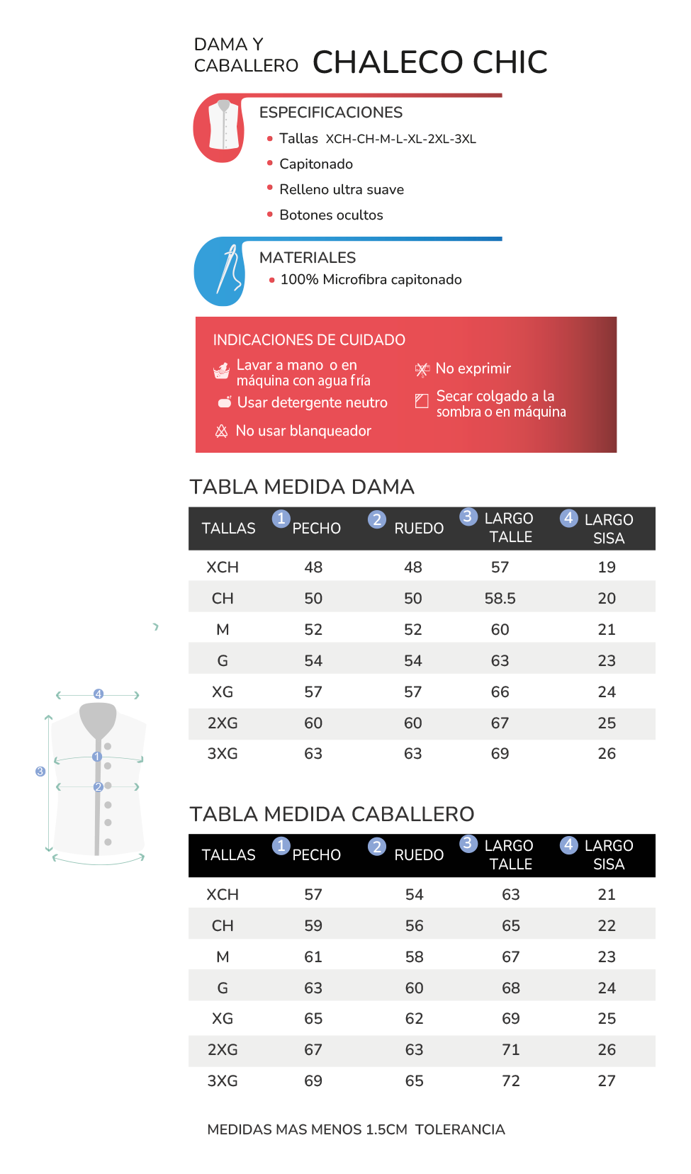 Chalecos confeccionado con 100% microfibra capitonada, on una tela suave al tacto, broches invisibles en tapa, cierre y carteras, ofrecen un diseño elegante y funcional para dama y caballero.